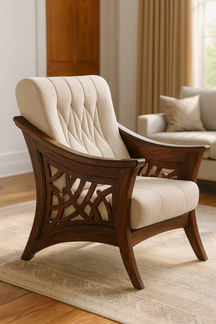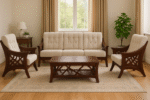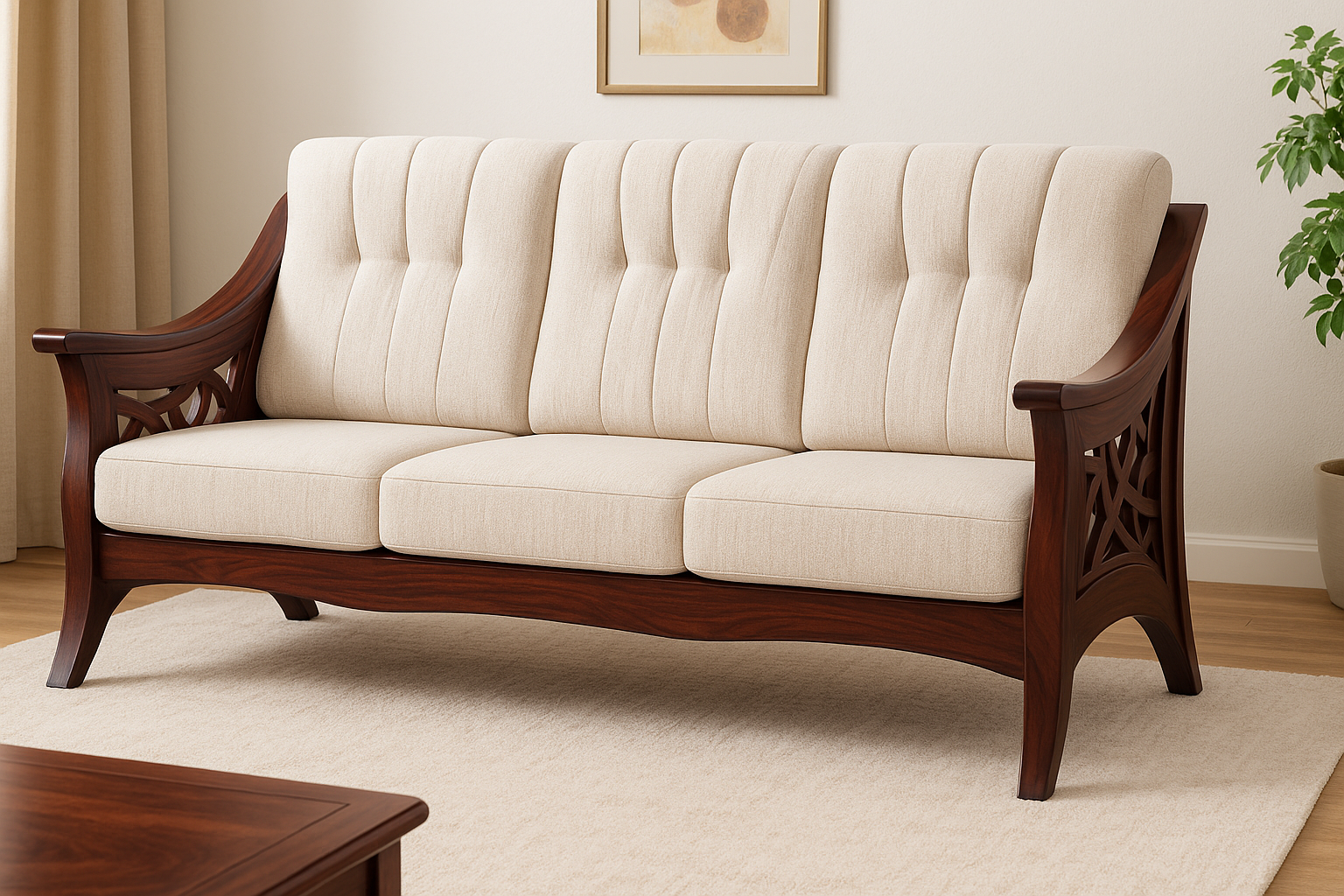 Redefine luxury living with this handcrafted Rosewood Five-Seater Sofa Set, designed to bring elegance and sophistication to your home. Crafted from premium solid rosewood, it features intricate curved arms and lattice-style detailing that reflect timeless craftsmanship. The soft beige cushions offer plush comfort, perfectly complementing the rich natural finish of the rosewood frame.