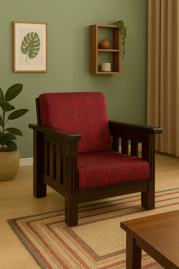 • Upholstery: Premium fabric with floral backrest and velvet-finish red cushions