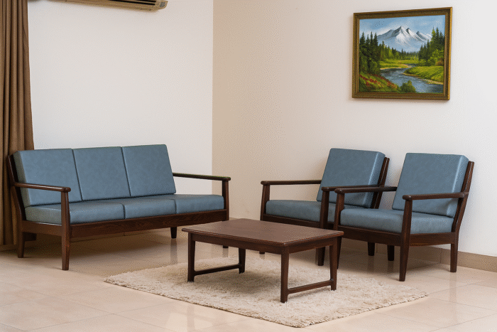 Experience timeless sophistication with this beautifully handcrafted Rosewood Sofa Set. Made from premium-quality solid rosewood, this set exudes strength, durability, and unmatched natural beauty. The rich dark finish enhances the elegant grain patterns, while the soft blue leatherette cushions provide exceptional comfort and a refined modern look.